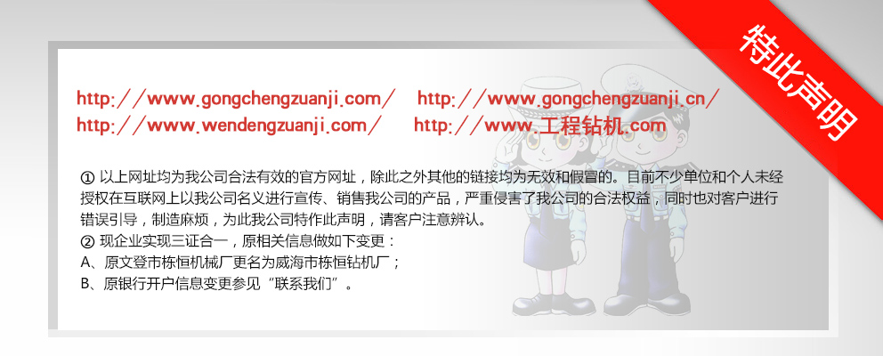 威海市棟恒鉆機(jī)廠(chǎng)隸屬于文登市工程鉆機(jī)廠(chǎng),主要生產(chǎn)、銷(xiāo)售工程鉆機(jī)。它坐落于文登市西鋪頭工業(yè)園,這里科技發(fā)達(dá),交通便利,制造業(yè)集中。 自1982年建廠(chǎng)以來(lái),經(jīng)過(guò)多年的優(yōu)化改革和沉淀積累,擁有精密、大型加工設(shè)備近百臺(tái)的生產(chǎn)企業(yè)之一。現(xiàn)在研制成功的GJ-400、GJ-250S、GJ-250A、GJ-240S、GJ-240A、GJ-180S、GJ-180A型等鉆機(jī)。在其它產(chǎn)品上,企業(yè)建立了長(zhǎng)期、中期、短期的發(fā)展規(guī)劃,一系列的高性能產(chǎn)品正在不斷推出中,企業(yè)應(yīng)市場(chǎng)需求對(duì)系列產(chǎn)品進(jìn)行了優(yōu)化組合,開(kāi)發(fā)了與之對(duì)應(yīng)配套的三腿、四腿單天車(chē)輪、雙天車(chē)輪鉆塔;泥漿泵—BW-160Q、BW- 200Q型球形閥泥漿泵大大提高了泵的使用性能和機(jī)械效率